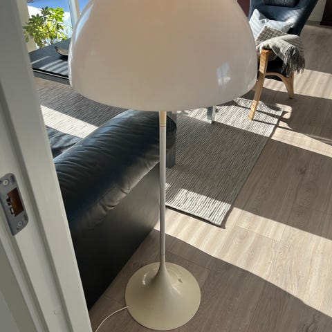 Original Panthella 500 hvid gulvlampe, der har været i brug (og altså ikke opmagasinerede) i familien i mange år. Rigtig fin stand - er lidt gulnet, men ikke ridset på hverken skærm eller fod. Tænd/sluk knap på fod virker dog uden lysdæmper.