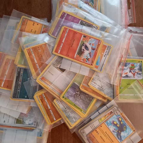 Min dreng samler ikke længere og ønsker at sælge ca. 100 Pokemonkort samt æske til opbevaring. Der er kort der glimter iblandt.