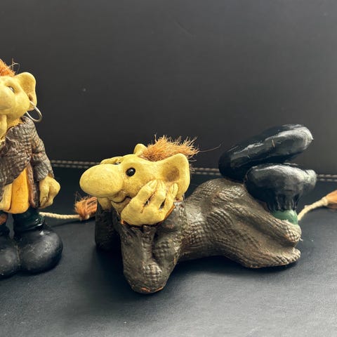 Ukendt mærke troldefigurer sæt med to dukker. Sættet består af to stående troldedukker med store næser og gråt hår. Den ene figur er klædt i brun dragt og bærer en kogleranke, den anden er klædt i grå og sort dragt og holder en stok. Figurerne er velegnede som dekoration, samlerobjekter eller pynt i hjemmet, fx til hylde eller reol. Materialet fremstår som tekstilbeklædte figurer med detaljeret ansigt og hænder i formet materiale.ca. 30 cm. H