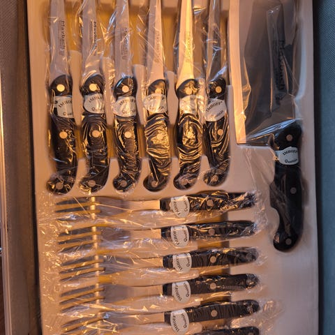 knivsæt i kuffert. Sættet består af flere køkkenknive, steakknive og gafler samt et strygestål, samlet i en hård plastkuffert med håndtag. Knivene har metalblade og håndtag med nitter. Velegnet som kompl til madlavning og servering i køkkenet.