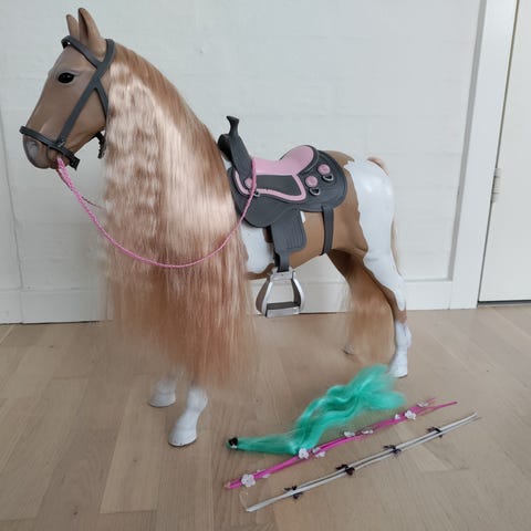 Our generation legetøjshest med lang man og hale. Hesten leveres med sadel, hovedtøj og tøjler samt forskelligt tilbehør til pasning og pleje, herunder strigler, børste, dækken og små udstyrsdelesom vist på billederne. Egnet som tilbehør til Our generation dukker og rolleleg med hestetema.