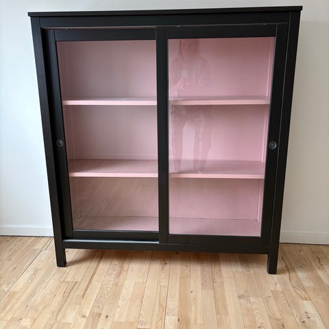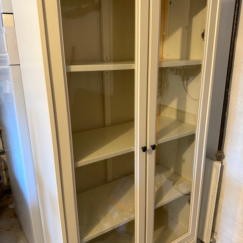 Fint vitrineskab i lys laminat med mange anvendelsesmuligheder. Til ophængning på væg. Nem montering.
