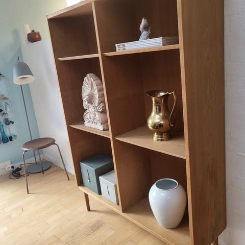 Egetræsreol i god stand. Den er nu nedslibet (se sidste to billeder). Hylderne kan sættes som man ønsker i reolen. Reoler af Poul Hundevad står ofte til 3000/5000 kr.