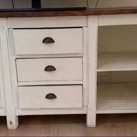 Møblet er velholdt og fremstår pænt, med en flot massiv trætop og hvidmalet korpus i tidløst, klassisk design.