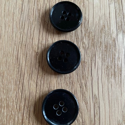 Runde 4-huls knapper i lysebrun plast. Egner sig til syning og reparation af tøj, strik eller andre kreative projekter. Antal som vist på billederne. 1 cmi diameter