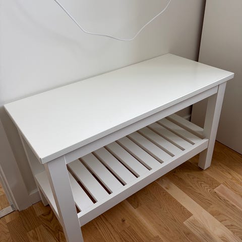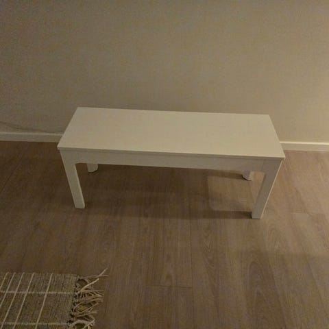 IKEA bænk i hvid. Rektangulær bænk med åben opbevaringshylde i den ene ende. Glat overflade og enkel, moderne udformning, egnet som siddeplads eller som lavt bord i fx entré, stue eller soveværelse. På overfladen ses en lille prik/mærke, som fremgår af billedet. Fra røgfrit og dyrefrit hjem.