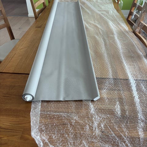 Design: Består af stof, med en alu lignende bagside der lukker alt lys ude! Trækkes ned med kæde.