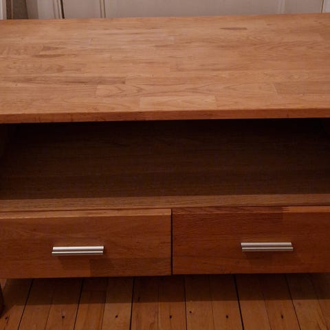 Rustikt TV- /sofabord i træ med rektangulær bordplade. Bordet har en åben hylde under bordpladen samt to skuffer nederst til opbevaring. Nederst er bordet monteret på hjul, så det er let at flytte. Velegnet som sofabord eller tv-bord i stue eller opholdsrum.