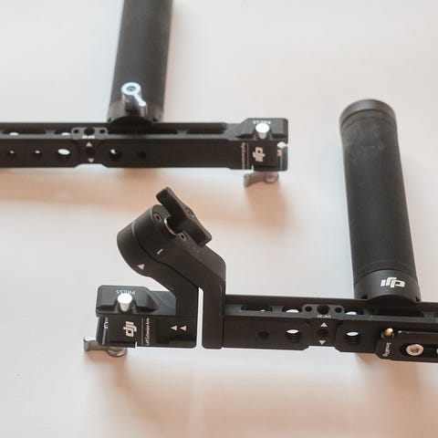 DJI kamerastabilisator gimbal i sort. Enheden er beregnet til stabilisering af kamera ved foto og videooptagelser. Gimbal-hovedet har justerbare arme og monteringsplade til kamera, og håndtaget rummer betjeningsknapper og joystick til styring af bevægelser. Leveres i transportkuffert med formstøbt indlæg og tilbehørsdele til montering og brug af gimbal med kompatible kameraer.