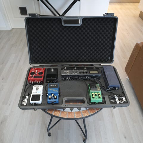 Pedalboard fra BOSS. Det oprindelige skum er brugt (men følger med). Til gengæld er der sat ny skum i, så man kan tilpasse fuldstændig til egne pedaler.