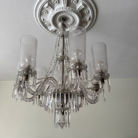 Super smuk lysekrone fra Lene Bjerre med prismer i antik sølv. Skaber et skønt lys.