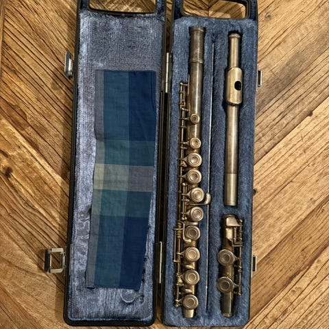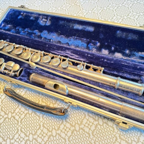 Tværfløjte i sølv eller plet med gravering.