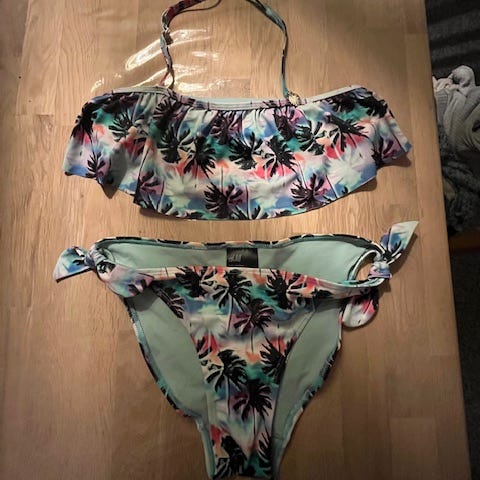 H&M bikini til pige i str. 134. Sættet består af bikinitop med stropper og matchende trusser. Farven er orange, og materialet er polyester med hulmønster yderst og glat foring inderst. Velegnet som badetøj til strand og pool for børn i den angivne størrelse. Top og trusser er nøjagtig samme farve, selv om det er forskelligt ud på billederne.