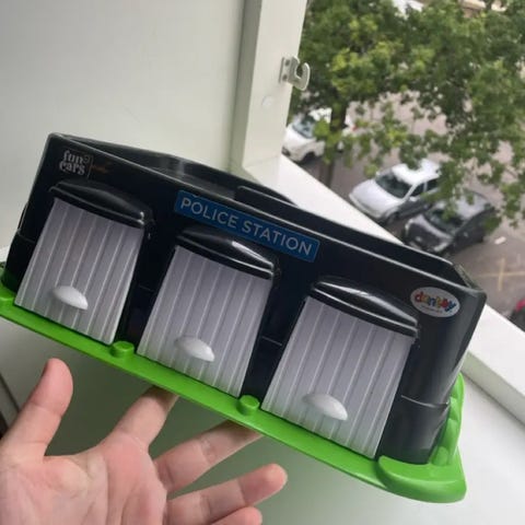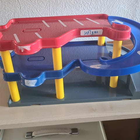 Garage til mindre børn. Plads til mange biler, der er større end Hotwheels. Man kan køre igennem og op på taget.