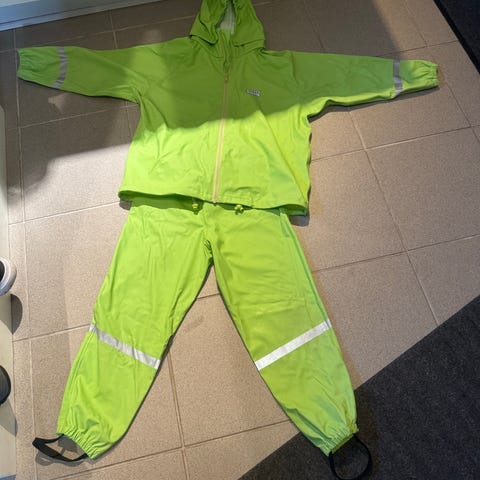 Kvalitetsregnsæt fra OCEAN bestående af jakke og overtræksbukser til børn. Sættet er i størrelse 6 år og er velegnet til unisex brug. Farven er gul, og materialet er “gummi”. Jakken har hætte og lynlås foran samt justerbar snøre forneden. Bukserne har seler og elastik ved anklerne. Sættet er egnet som yderlag i vådt eller blæsende vejr.