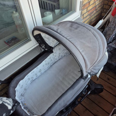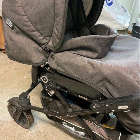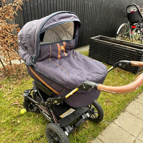 Emmaljunga barnevogn kombivogn i mørkegrå tekstil. Vognen har et stel med fire hjul og justerbart håndtag. Der medfølger både liggedel og klapvognsdel, som kan skiftes på stellet. Liggedelen har kaleche og overdække, og klapvognsdelen har justerbart ryglæn og fodstøtte. Vognen egner sig til transport af spædbørn og mindre børn på gåture og hverdagsture.