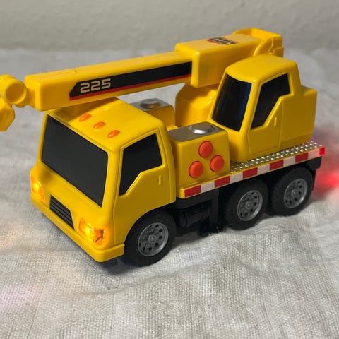 Kranvogn med lys og lyd. Snoren kan ikke hales ind, men ellers fejler vognen ikke noget. Der er en krog, så man kan trække andre vogne.