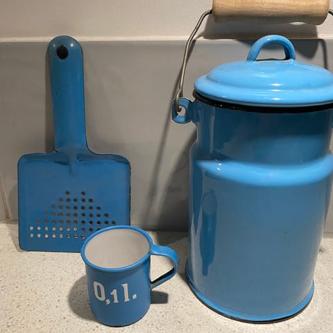 15 stk. blå emalje køkkenting, sælges helst samlet