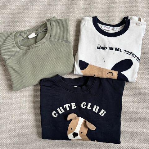 Trøje, bukser, poncho str. 86, - 1 trøje med knapper, 1 velour trøje med lynlås og hætte, 1 par bukser samt 1 poncho sælges samlet for 50 kr..