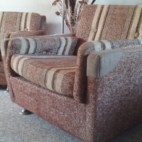 Sofaen har to sæder som kan lægges ned, og lænestolen kan også lægges ned.