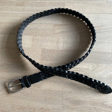Sælger et læder "Bella belt", sort med guld spænde. Det er et bælte der kan løsnes og strammes uden at åbnes og derved uden huller. Mega smart. Det er helt nyt og heller ikke klippet til.