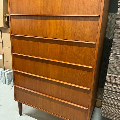 Dansk designet kommode i fineret teak. 6 skuffer. Ingen nøgle