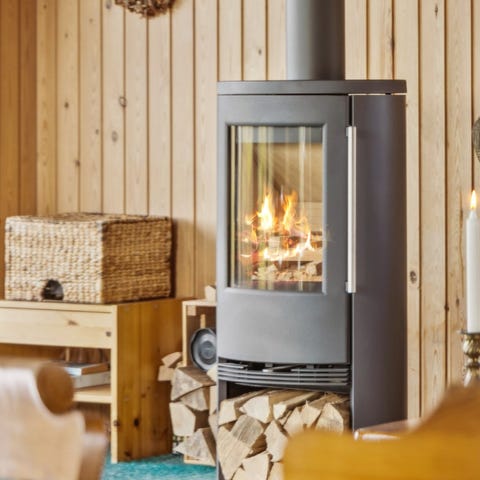 Brændeovn med fedtstensbeklædning i blå/grå farve.