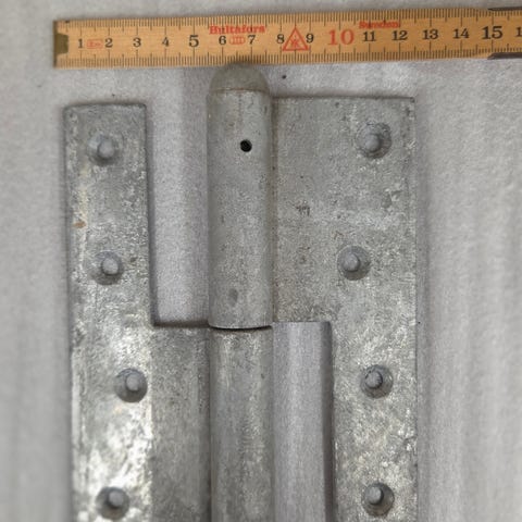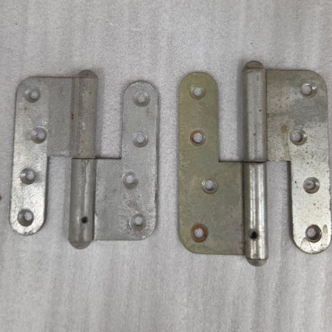 Galvaniserede metalhængsler velegnet til døre, porte eller låger. På billederne ses målene for bedre vurdering af størrelse. Egnede til udendørs eller indendørs brug, hvor der ønskes robuste hængsler i galvaniseret stål.