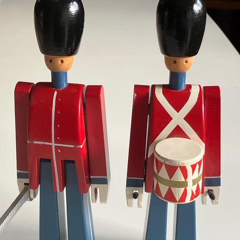 Kay Bojesen garder trommeslager træfigur i blå og sorte nuancer med hvidt trommeslagersæt. Figuren er udført i træ med malede detaljer og leveres i original emballage. Velegnet som dekorationsfigur eller samlerobjekt i hjemmet.