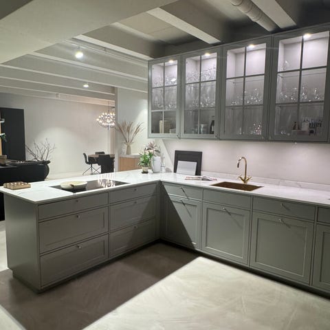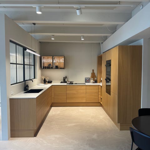 Udstillingskøkken Form 1 i eg sælges. 1,5 år gammelt og helt ubrugt, Bordplade: Natursten, Taj Mahal, Miele Køleskab, kogetop m/emhætte, Ovn og Kombi-dampovn. 2 års butiksgaranti.