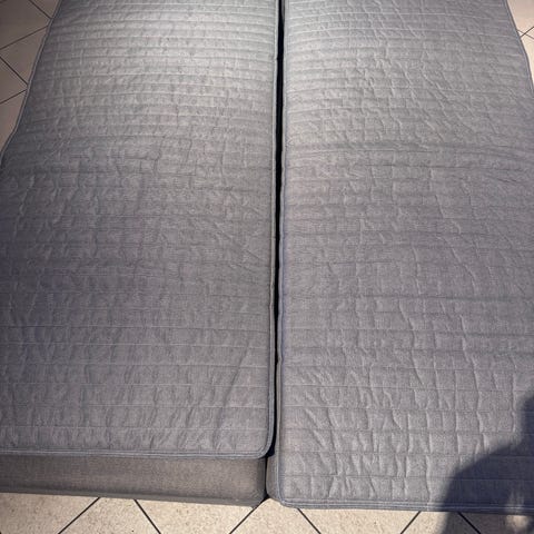 IKEA seng med topmadras i lys grå/beige polstring. Sengen står på træben og har en enkel, rektangulær ramme. Topmadrassen ligger løst ovenpå sengen og kan løftes af. Topmadrassen er i koldskum og altid brugt med madrasbeskytter (madrasbeskytter medfølger ikke). Har stået i gæsteværelse, derfor brugt meget lidt. Lidt slid på siden, se billeder. Størrelse 80x200.