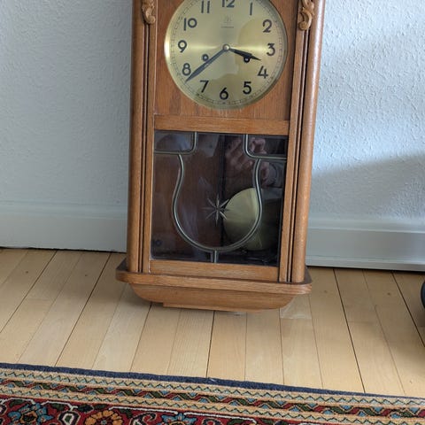 Junghans mekanisk vækkeur i messing. Uret har dobbeltklokke på toppen og hvid urskive med sorte tal og dekorativt mønster. Mekanisk optræk på bagsiden med separate indstillinger til ur og alarm. Velegnet som bord- eller natbordsur.