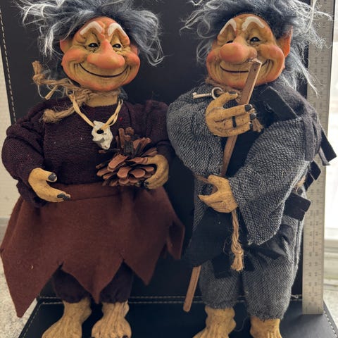 Samling af nisse- og troldefigurer i polyresin. Figurerne forestiller forskellige karakterer med detaljerede ansigter og hår, nogle med bøger eller andre genstande i hænderne. Egnede som dekoration i hjemmet, på hylder eller som del af en samling af fantasifigurer.