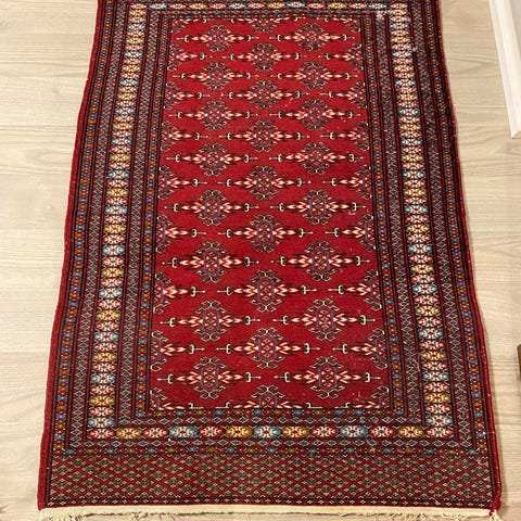 tæppe med orientalsk inspireret mønster i røde og beige nuancer. Tæppet har klassisk bort langs kanten og detaljeret mønster i midterfeltet. Egnet som gulvtæppe i stue, entré eller andre opholdsrum. Mål 120x170 cm