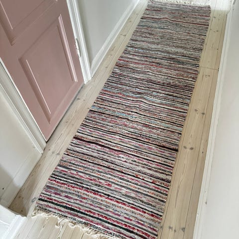 Smukt kludetæppe/løber i fine farver. Har nogle løse tråde i enden. Se billeder Måler ca. 72 * 190 cm.