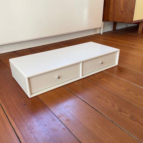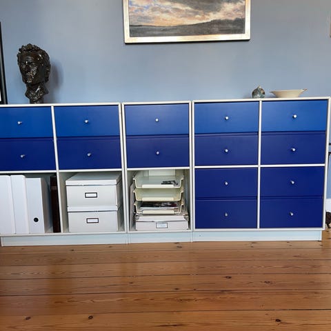 Flot Montana opstilling på sokkel, med 2 rummelige skuffer samt 2 mindre låger. Farve: Koksgrå. Flot stand med meget begrænset patina. Dybde: 46,5 cm. H: 76,5 cm. B: 69,5 cm.