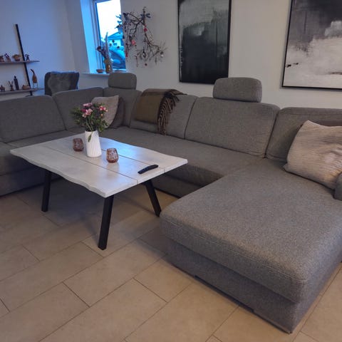 Stor flyder U sofa i grå incl nakkestøtte, perfekt til den store (eller lille) familie.