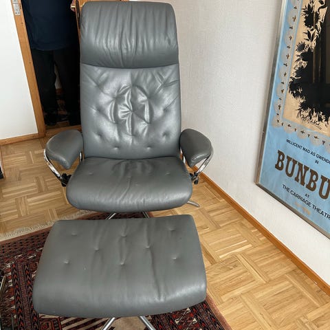 Stressless View sæddebredde 50 cm. fra røgfrit miljø da den ikke bliver brugt, den er i pæn stand. men har en meget lille skade øverste hjørne. Ny Fast pris 5000 kr afhentes i stueetage.