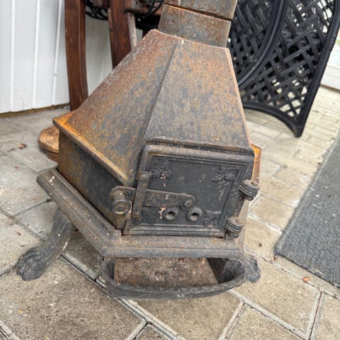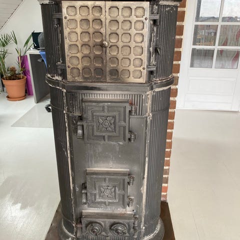 Støbejernsovnen er af ældre dato og desværre er der ingen skorsten med. Den kan derfor bruges som dekoration