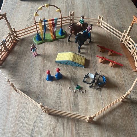 Schleich Stævne træning. Sættet indeholder blandt andet heste, hegnselementer og et spring. I rigtig god stand.