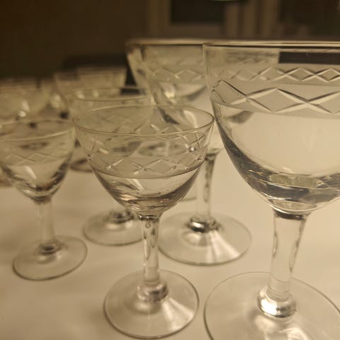 Pæn generel stand, men nogle glas har let glaspest (mat sløring i glasset). Stadig fuldt brugbare og dekorative.