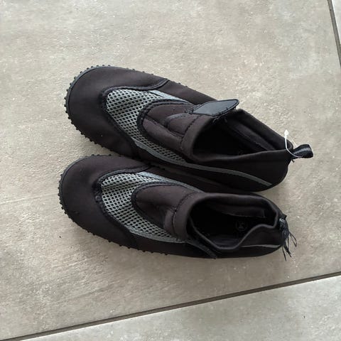Vandsko i blå med grønne detaljer. Modellen har elastisk snørelukning bagpå for justering af pasform. Overdelen er i let og hurtigtørrende materiale med mesh-paneler i siderne for ventilation. Skoene har fleksibel, mønstret gummisål, der giver bedre greb på våde overflader. Velegnet til brug ved strand, pool og andre vandaktiviteter.