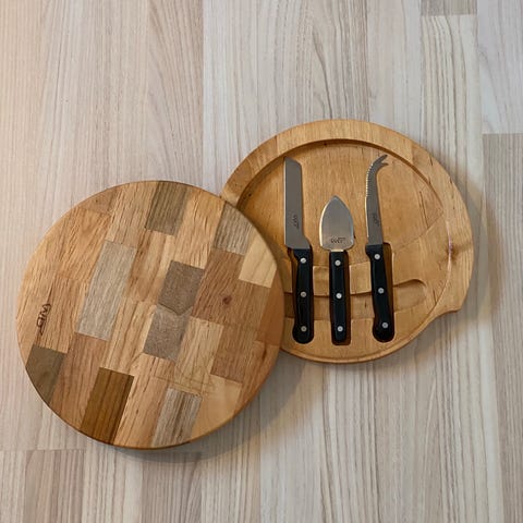 Oste-/skærebræt med drejelåg og rum til knivsæt bestående af 3 forskellige osteknive.