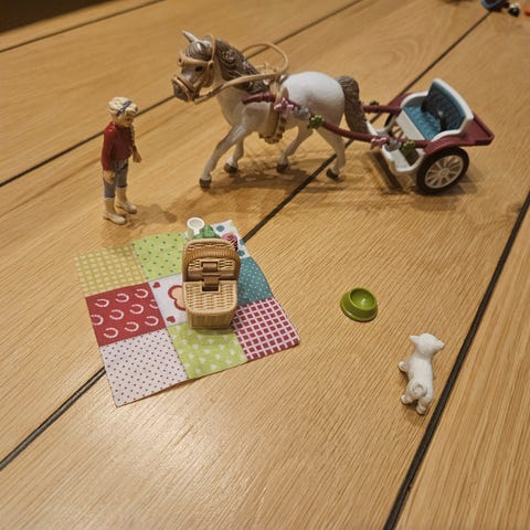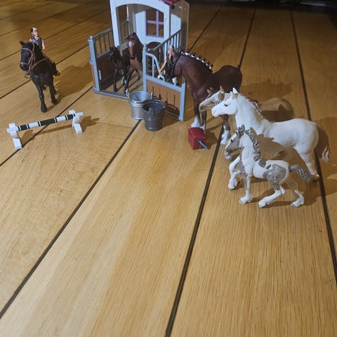 Schleich legesæt med hest, menneskefigur og forskelligt tilbehør. Sættet indeholder blandt andet en hest, en rytter, vogn, et lille telt , samt mindre dele som dyr og udstyr. I rigtig god stand.