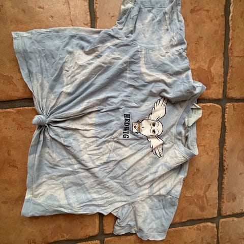 H&M T-shirt til pige i str. 146. T-shirten er rustrød og fremstillet i bomuld. Forsiden har Hogwarts-tryk med bogstaver og motiver fra Harry Potter-universet samt lille HP-mærke nederst. Kortærmet model med rund hals, egnet som hverdagsbluse eller til fritidsbrug.