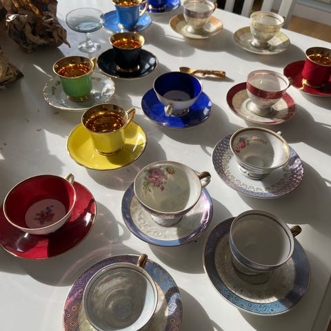 Sæt med seks franske tekopper og underkopper i opalglas.