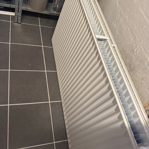 Hvid radiator i metal med lodrette paneler. Standard vandbåren radiator egnet til montering på væg i fx bolig, kælder eller bryggers. Klassisk rektangulær model med øvre gitter til luftcirkulation. Velegnet til centralvarme- eller fjernvarmeanlæg, afhængigt af installationens system og tilslutning.