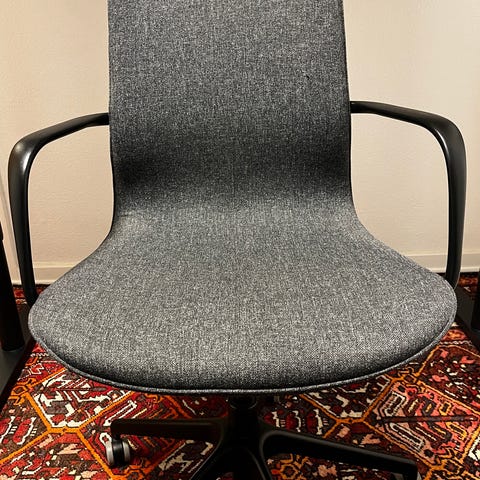 Kontorstol eller konferencestol fra IKEA Långfjäll. Den har vippefunktion og kan justeres i højden. Farven er blålig med struktur. Sort stel med hjul.