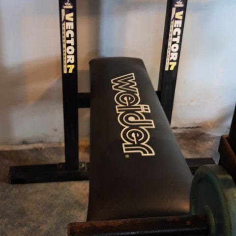 Super kvalitet, Weiider. Meget holdbar, flot stand. I stål og med polstring og læder på sæde og ryglæn. Øvelser til både både bryst, ryg og ben, for og bag. Vægtstang af jern. 10 vægtskiver medfølger af forskellig størrelse samt 4 enkelte håndvægte og diverse løsdele. Står i Aarsdale.