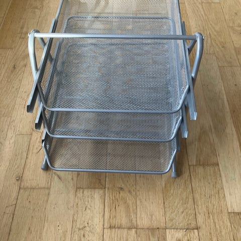 Brevbakke med 3 etager i perforeret metal. Farven er sølvgrå. Velegnet til opbevaring og sortering af papir, dokumenter eller mapper på skrivebordet. Stabil metalramme med bakker, der giver godt overblik over indholdet). Som ny. Dog mangler der en “dut” (se sidste billede).